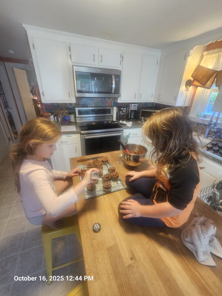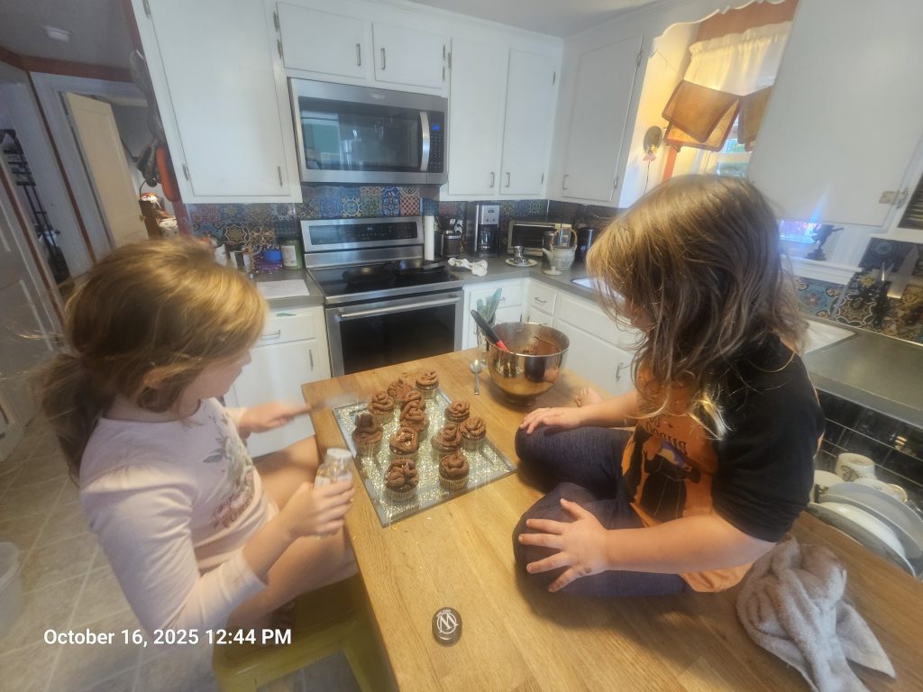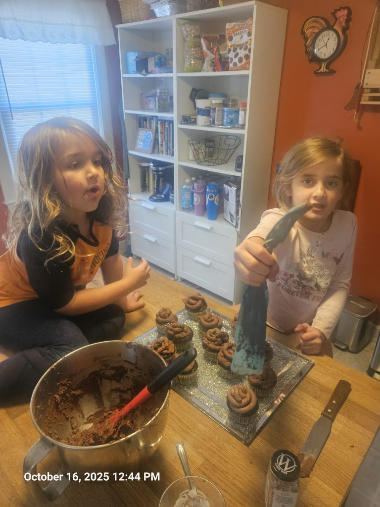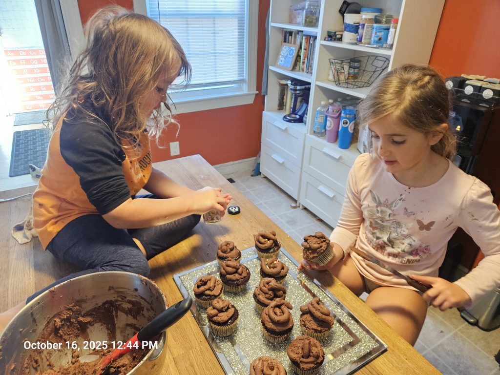 So, Wednesday after dinner, we started. We learned about adding hot water to cocoa to make it even chocolate-ier. Penny measured most of the ingredients. Minimal mess was made. The cupcakes were baked and set aside to cool until the next day when they would be frosted.